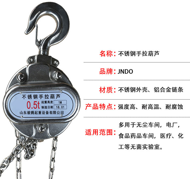 不锈钢手拉葫芦采用304不锈钢材质,广泛应用于海洋工程、船舶修造、海上石油平台、海洋运输。可在海洋环境、腐蚀环境下使用,不锈钢手拉葫芦的出厂前经过严格的2000小时的盐水喷雾检测,具有极高的防腐蚀特性,产品品质***,可放心购买使用。不锈钢手拉葫芦除可单独使用外,还可同电动葫芦、链动或电动小车装配在一起,悬挂在建筑物的顶棚或起重机的顶梁上使用,也可配合单轨小车,实现左右行走提升重物的功能。
